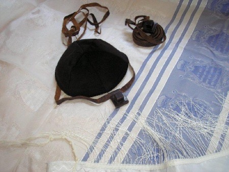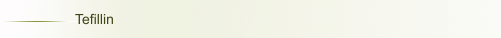 Tefillin (dt. Gebetsriemen) bestehen aus einem Lederriemen, an dem eine Kapsel mit Schriftröllchen befestigt ist. Es gibt einen Riemen für den Arm und einen für die Stirn. Der Armriemen wird bei Rechtshändern um den linken Arm gewickelt, bei Linkshändern um den rechten. Der Riemen für die Stirn wird so über den Kopf gestülpt, dass die Kapsel über der Stirn hängt. Die Tefillin gehen auf das Gebot aus 5. Mose 6,8 zurück, sich Gottes Worte "als Zeichen auf deine Hand zu binden und sie sollen als Merkzeichen zwischen deinen Augen sein". In den Kapseln befinden sich kleine Pergamentröllchen mit den Texten aus 2. Mose 13,1-10, 2. Mose 13,11-16, 5. Mose 6,4-9 und 5. Mose 11,13-21. Die Beschriftung der Pergamentröllchen ist kalligraphisch äußerst anspruchsvoll. Bei Ausgrabungen in Qumran wurden 2000 Jahre alte Kapseln in der Größe eine Centstücks! gefunden. Im Inneren mit 4 Schriftrollen!