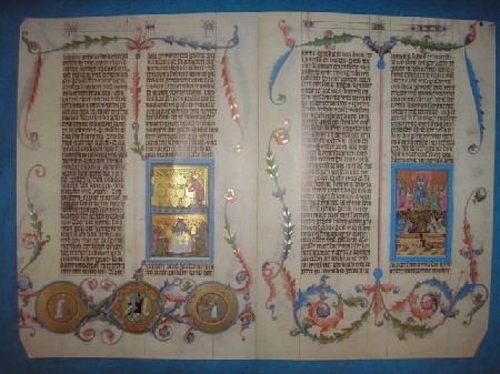 Die älteste Prachtbibel in deutscher Sprache ist die Wenzelsbibel. Sie entstand 1395-1400 n. Chr. für König Wenzel in Prag. Sie wurde leider nicht fertig gestellt und umfasst nur das AT bis zum Propheten Hesekiel. Aber schon dieser Teil ist in 6 Bände gebunden und beinhaltet 1214 Pergament-Blätter, also 607 Doppelblätter, die je aus einer Kalbshaut gefertigt wurden. Die Doppelblätter haben das Format 73x53cm. Da wird deutlich, was mit der Redewendung „das geht auf keine Kuhhaut“ gemeint war – bei diesem Format war die Grenze dessen, was die Felle hergaben erreicht.