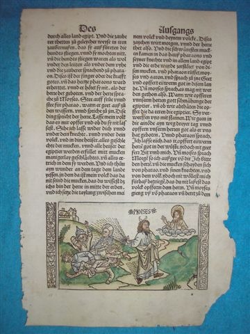 Der Holzschnitt zeigt Moses und die geplagten Ägypter. Moses wird gehörnt dargestellt. Dies beruht auf einem Vokalisationsfehler. Siehe hierzu „Die Geschichte der Bibel AT“. Hieronymus konnte bei der Übersetzung der Vulgata aus dem Hebräischen noch nicht auf die Vokalisation der Masoreten zurückgreifen. So vokalisierte er, der ansonsten ausgezeichnet übersetzte, hier ausnahmsweise fälschlich die hebr. Konsonanten „krn“ zu „keren“, was „gehörnt“ bedeutet, anstatt zu „karan“, was „strahlend“ bedeutet.