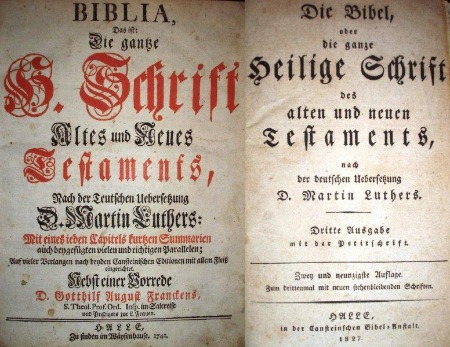Collage: Bibel von 1741 aus dem Waisenhaus Halle, Bibel von 1827 aus der Cansteinschen Bibelanstalt Halle
